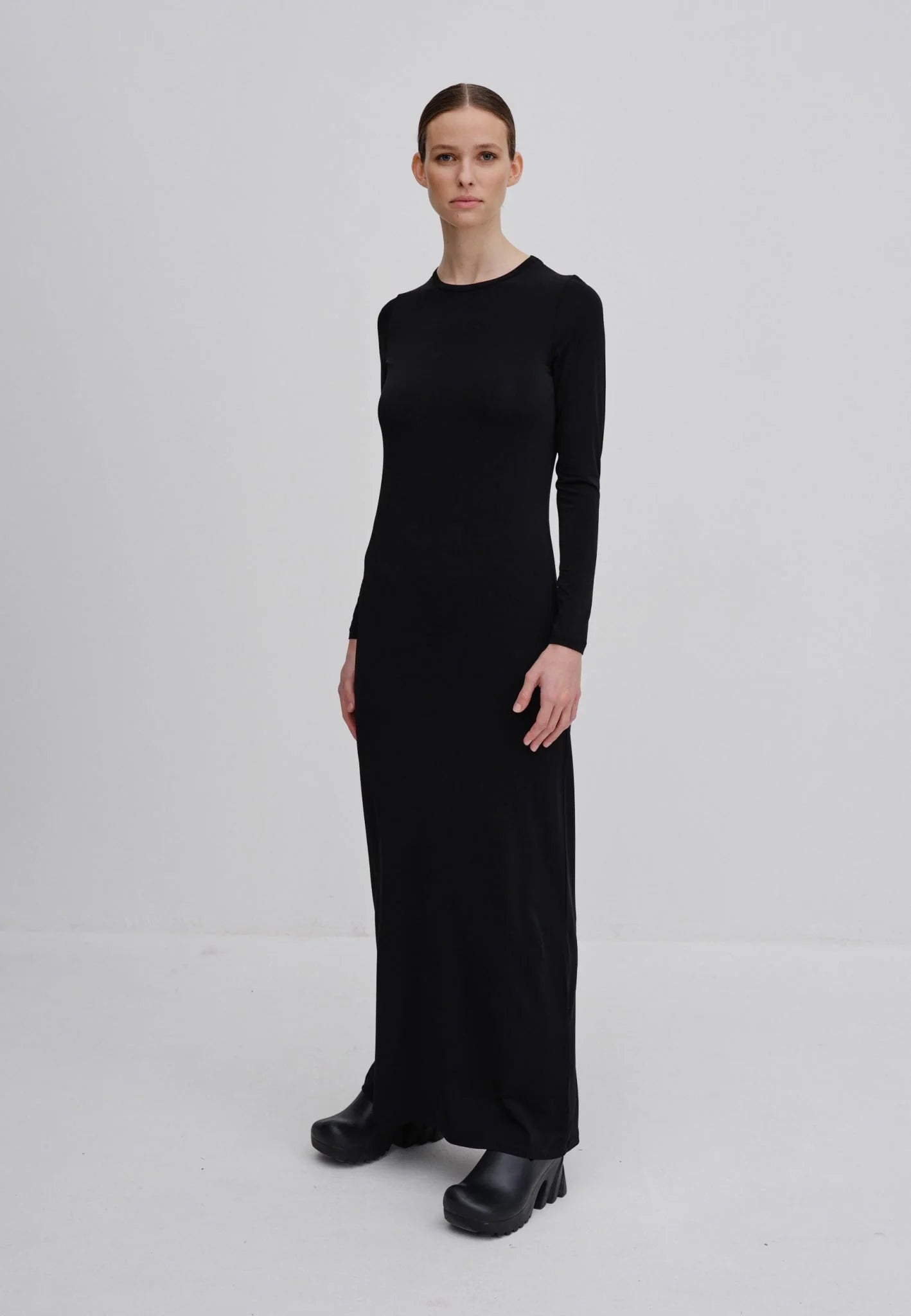 introducing the christy dress: a black maxi dress with long sleeves, a regular-to-relaxed fit, a wide oval neck, and a subtly dropped shoulder, epitomizing timeless elegance