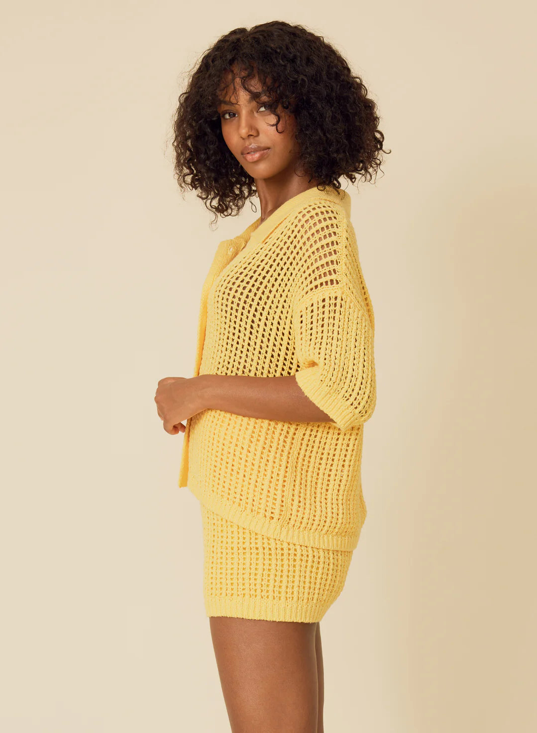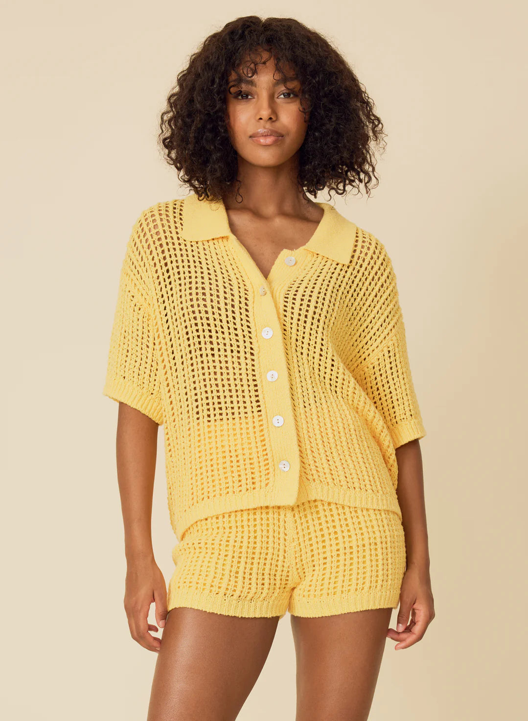 knit from their nubby cotton yarn in an open stitch, this short sleeved shirt features a boxy and easy fit, chunky rib trims, and shell buttons