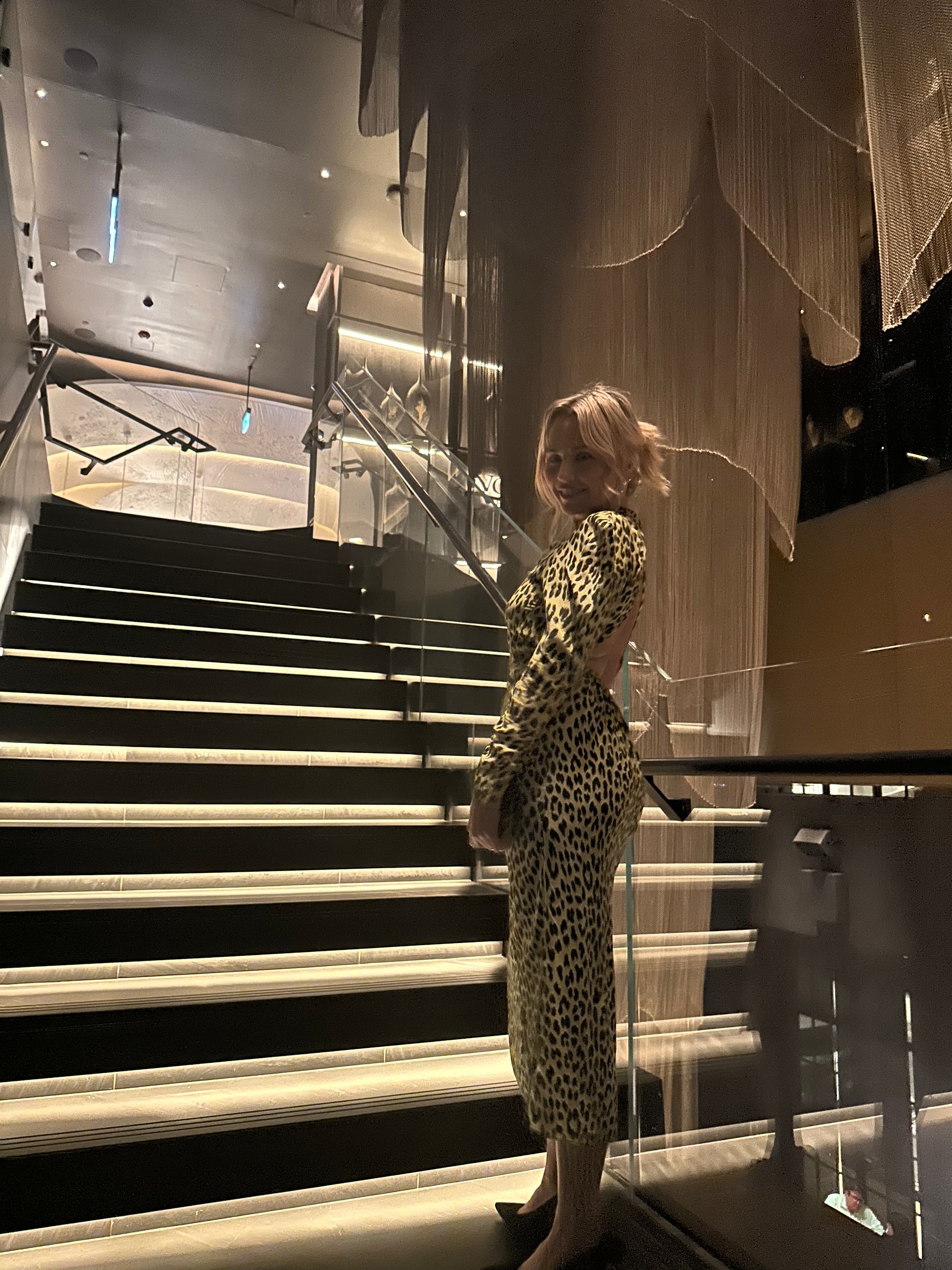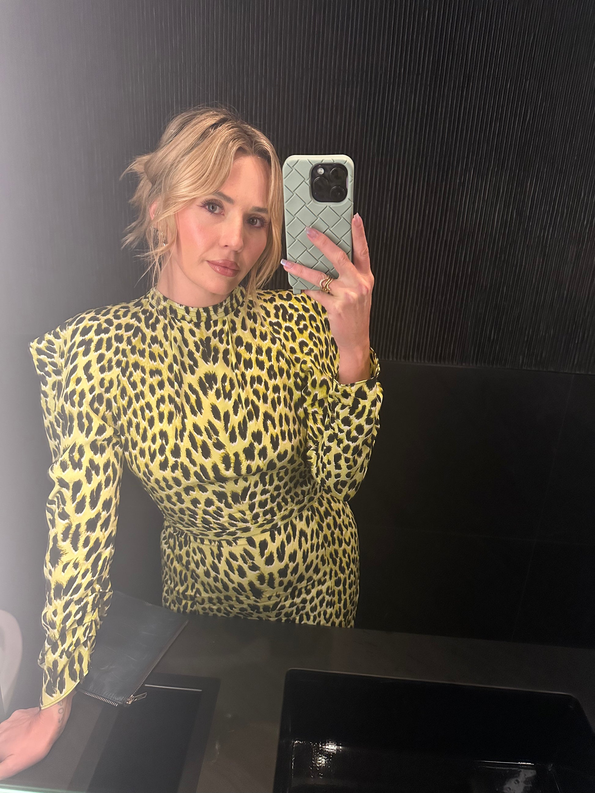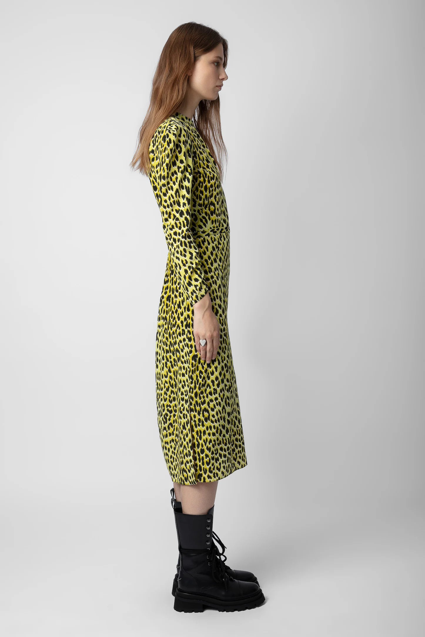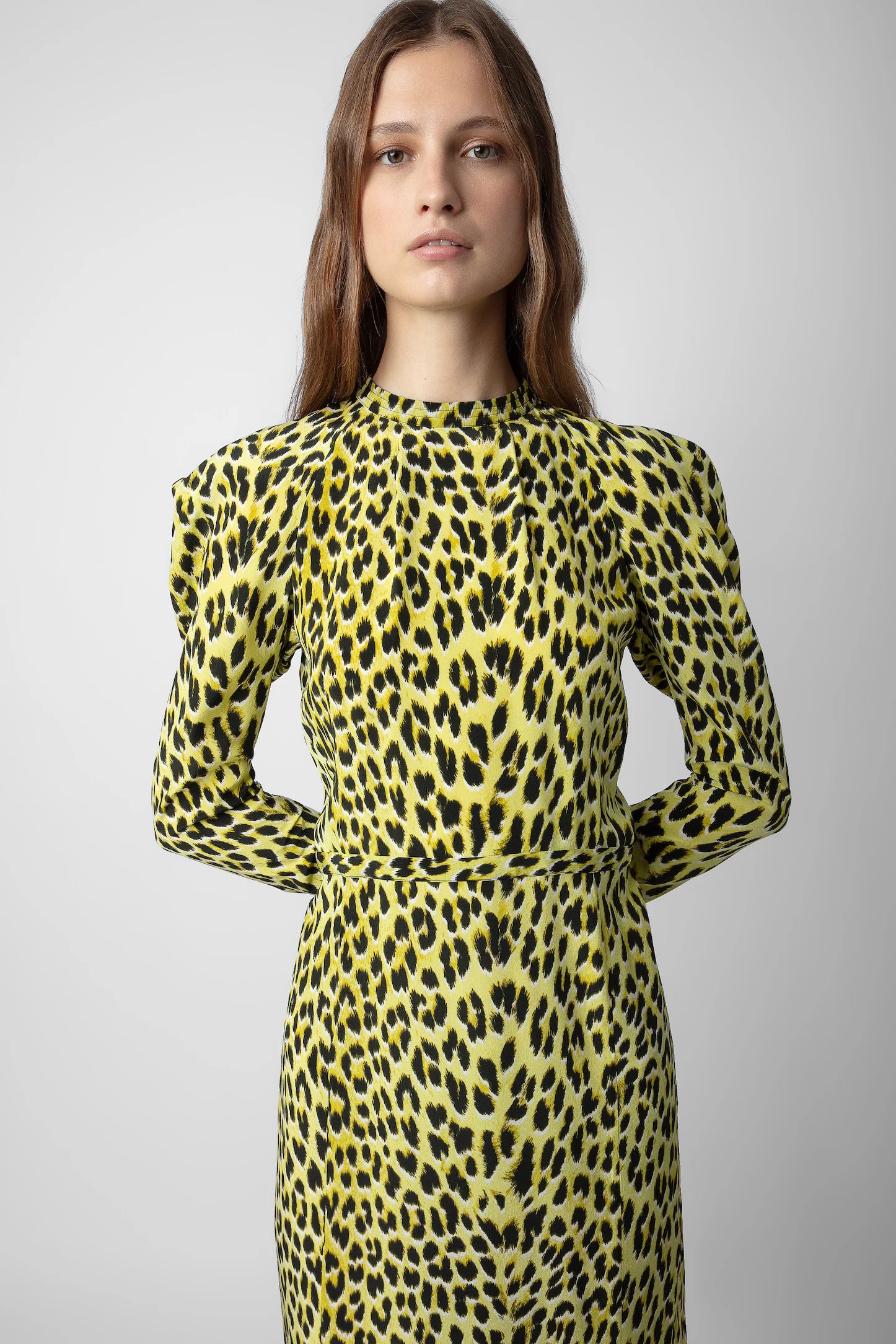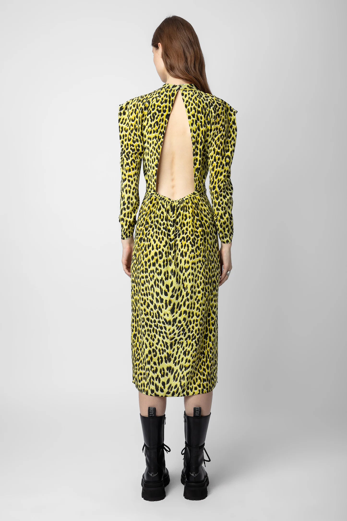 long yellow leopard-print silk dress with shoulder pads, belt and cut-out on back
