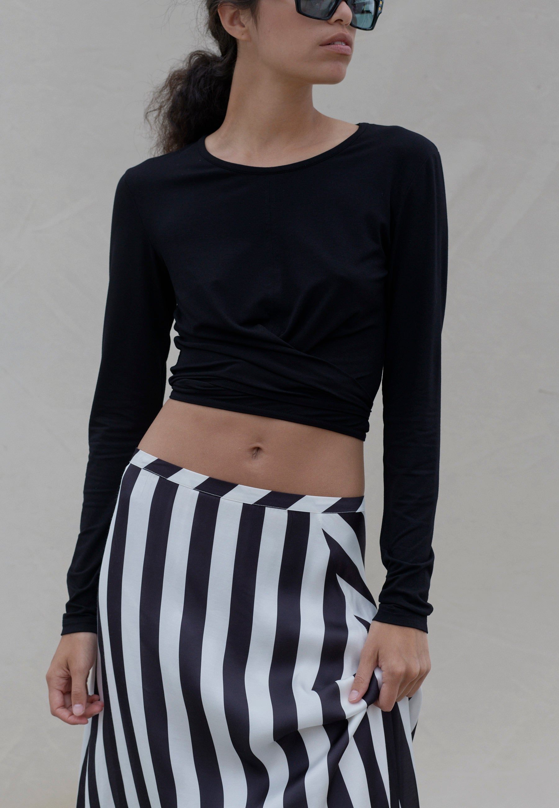 the long vertical black and white stripes are ultra-chic and flattering, making this a must-have item for your wardrobe
