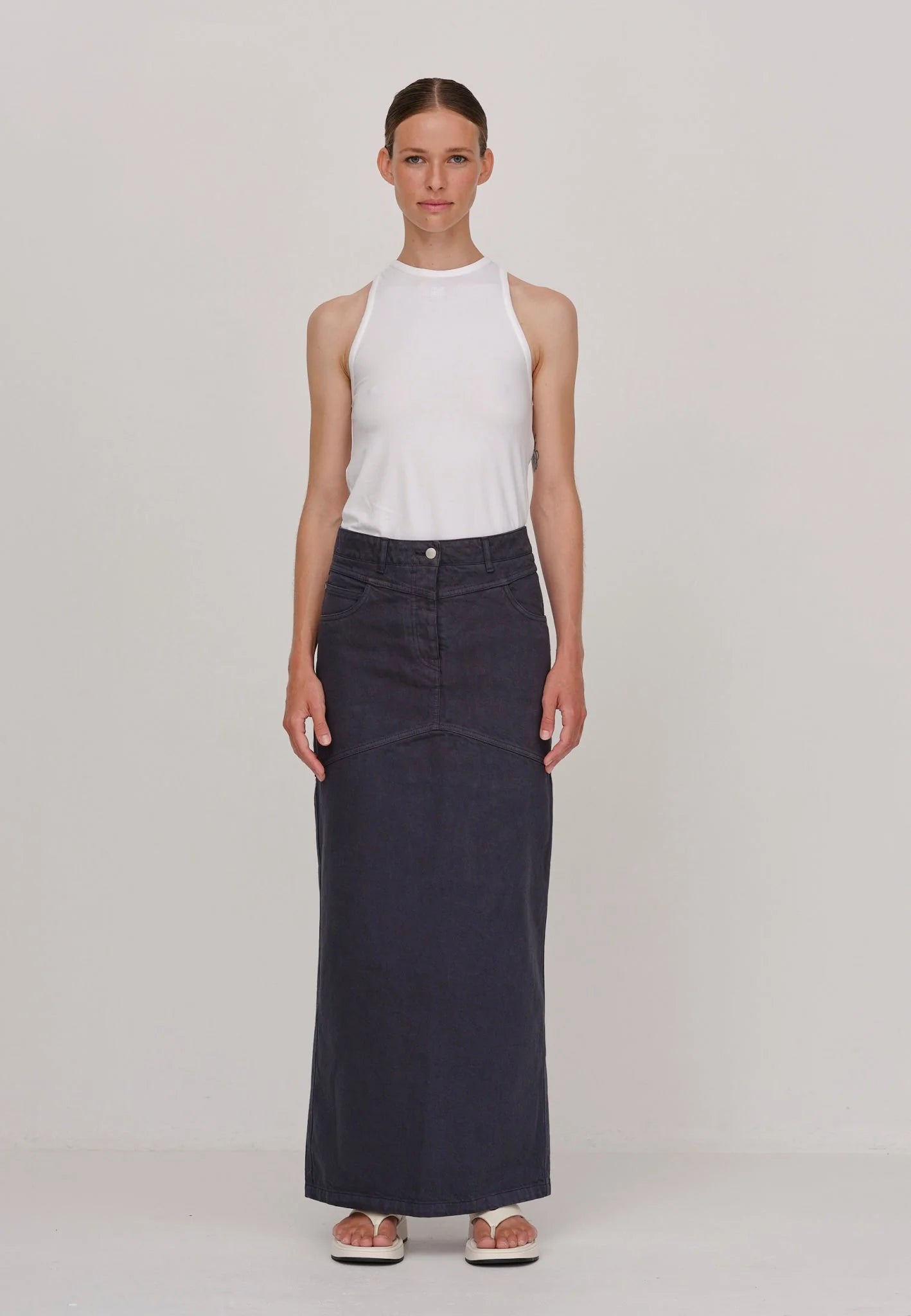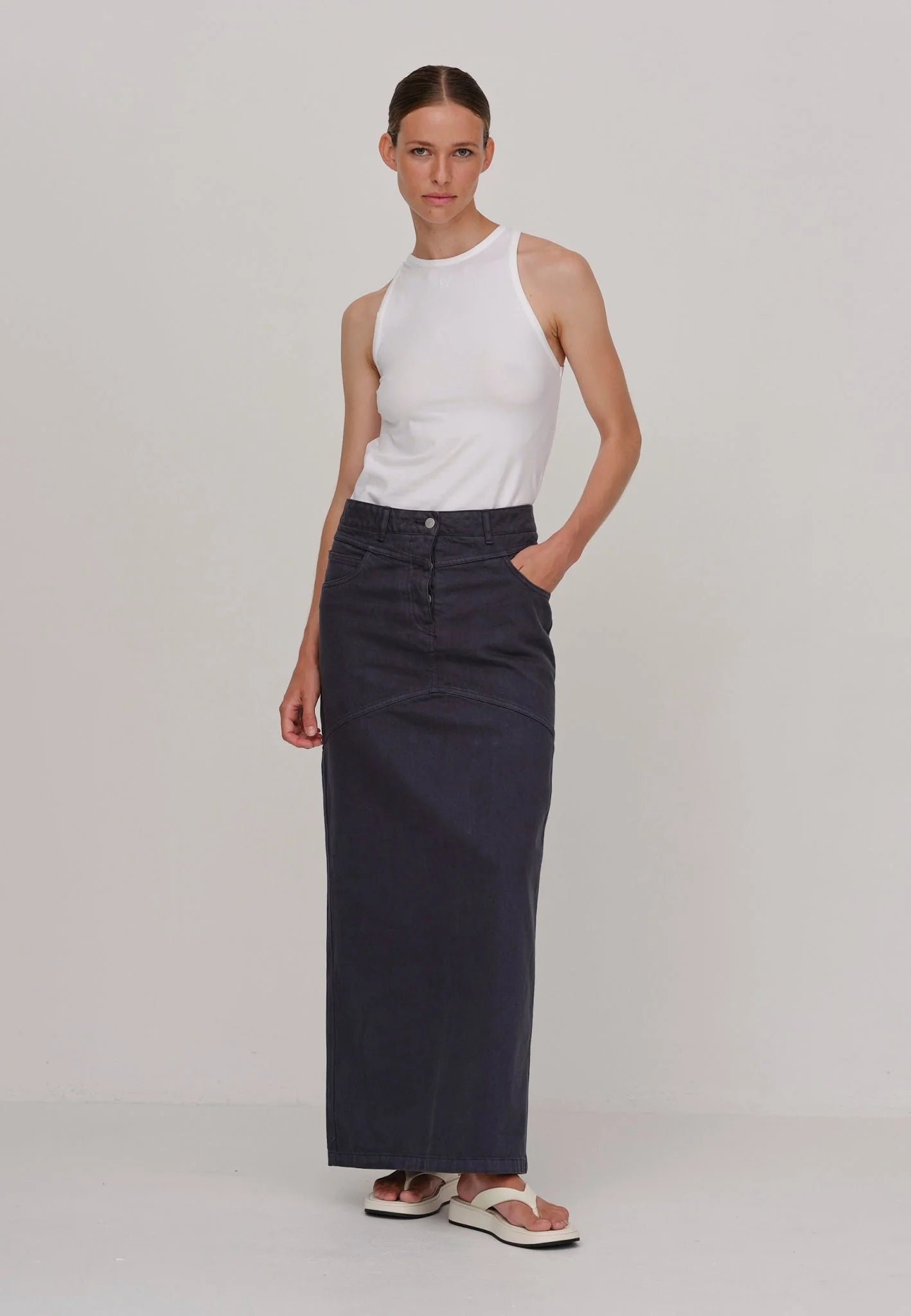 the nikita skirt is a mid-waisted long skirt with denim details and a long slit at the back