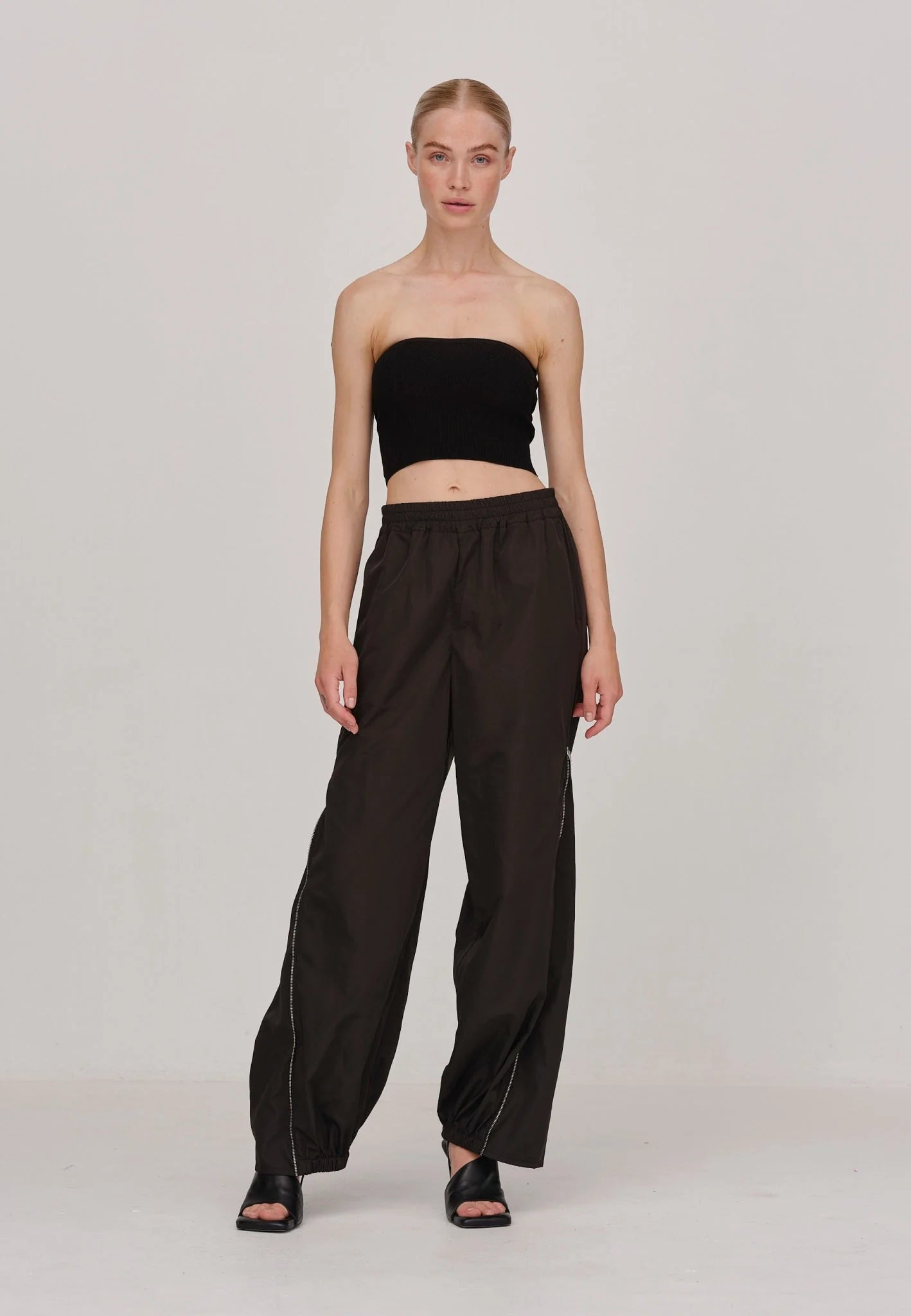 the tracy pants is a pair of oversized track pants featuring an elastic waistband, patch back pocket, and zipper details at the side seams