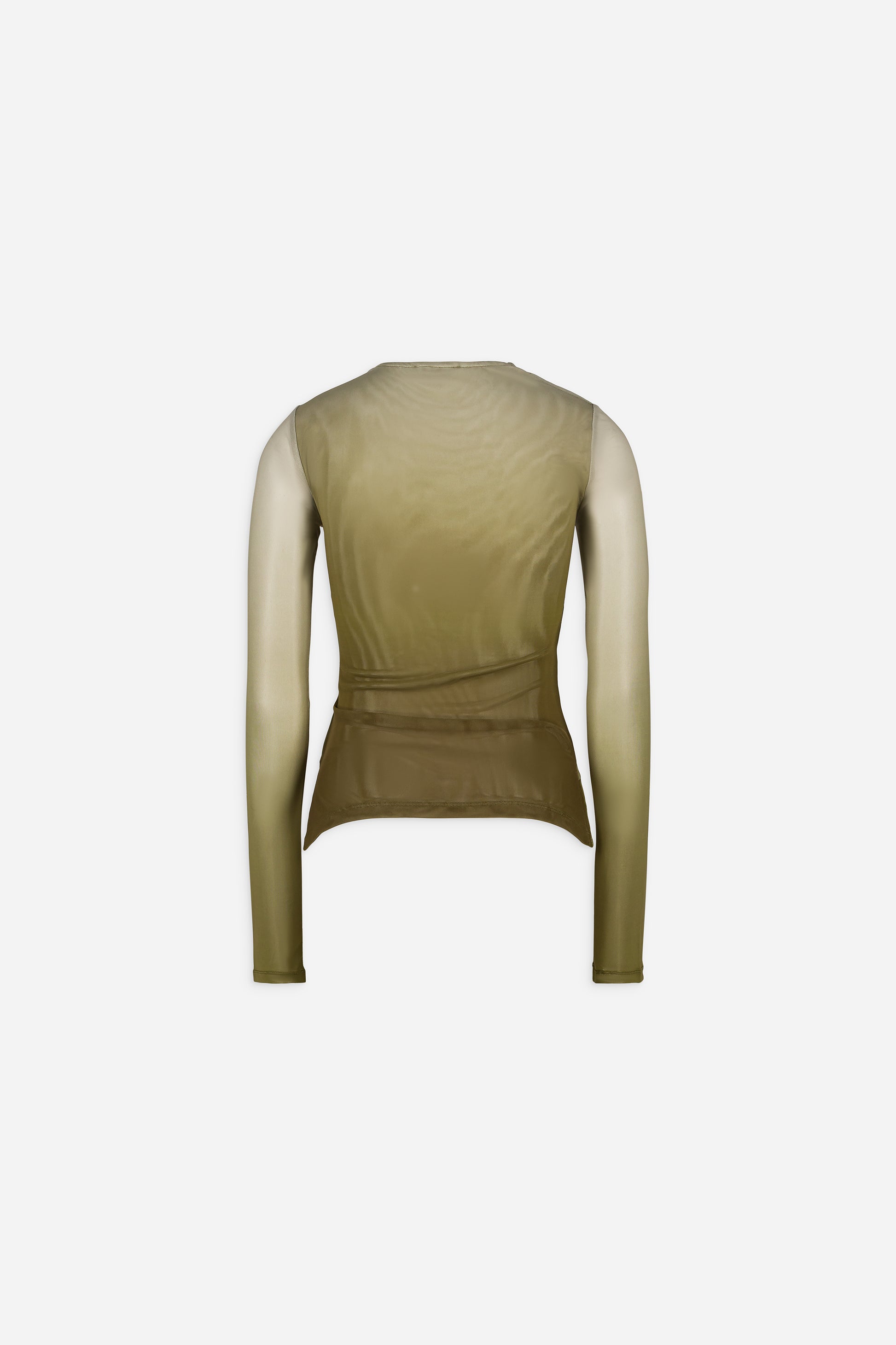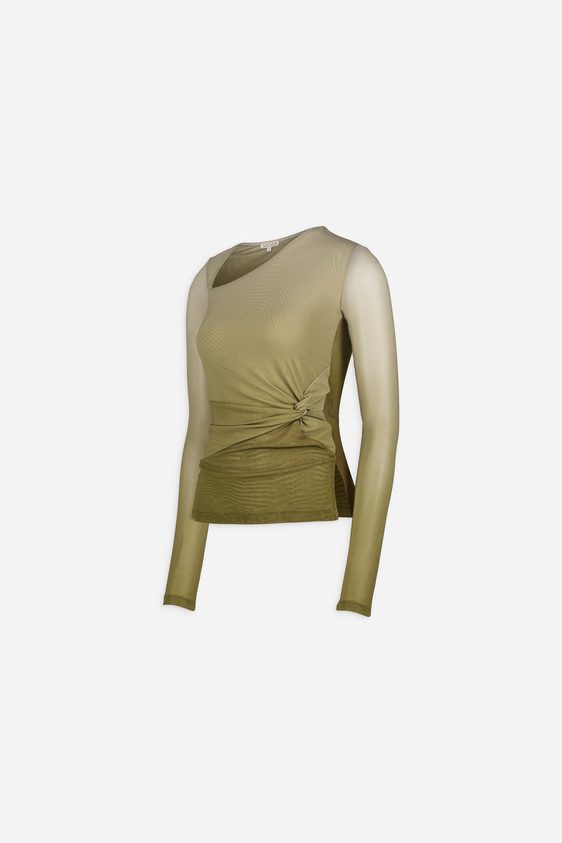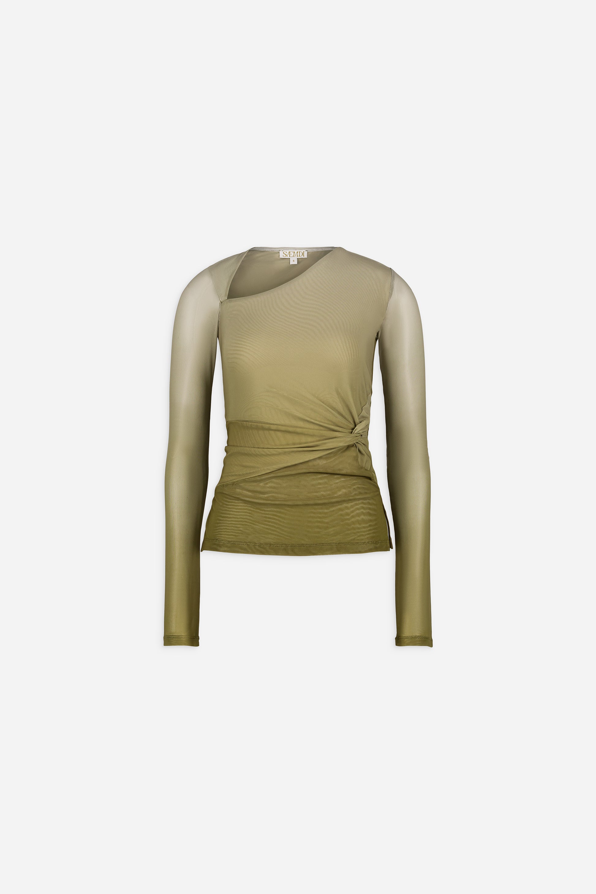 fitted gradient mesh top with partial lining, asymmetrical neckline, knot detail at waist and side slits