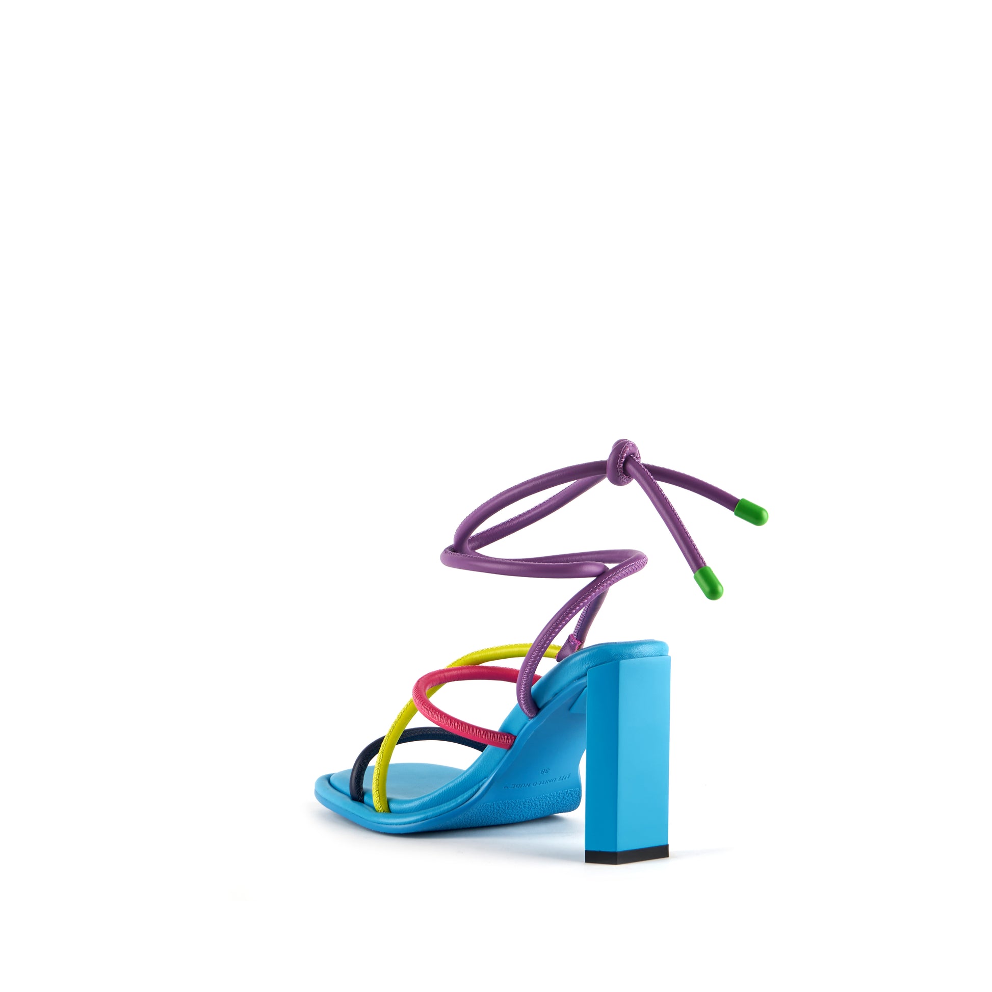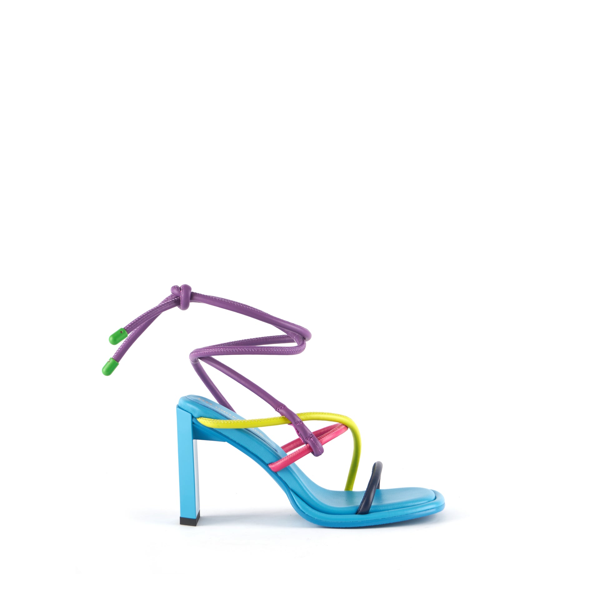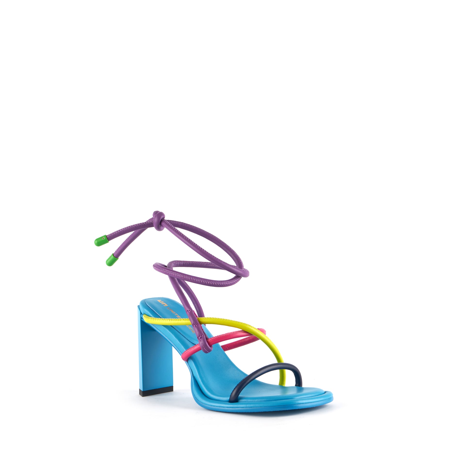the tara ka hi is a strappy high-heeled sandal with puffed leather straps, an ankle tie with metal aglets, and an oversized rand