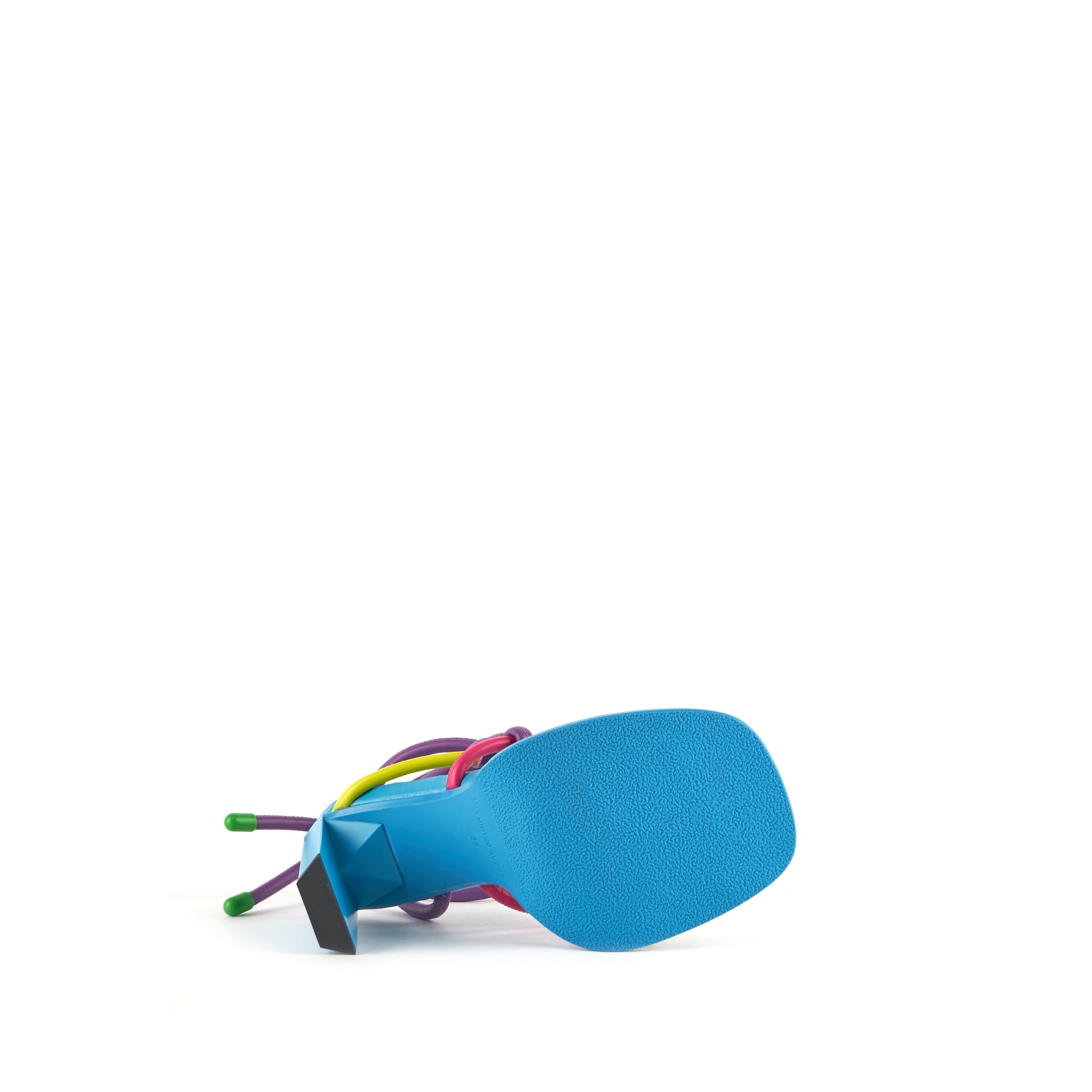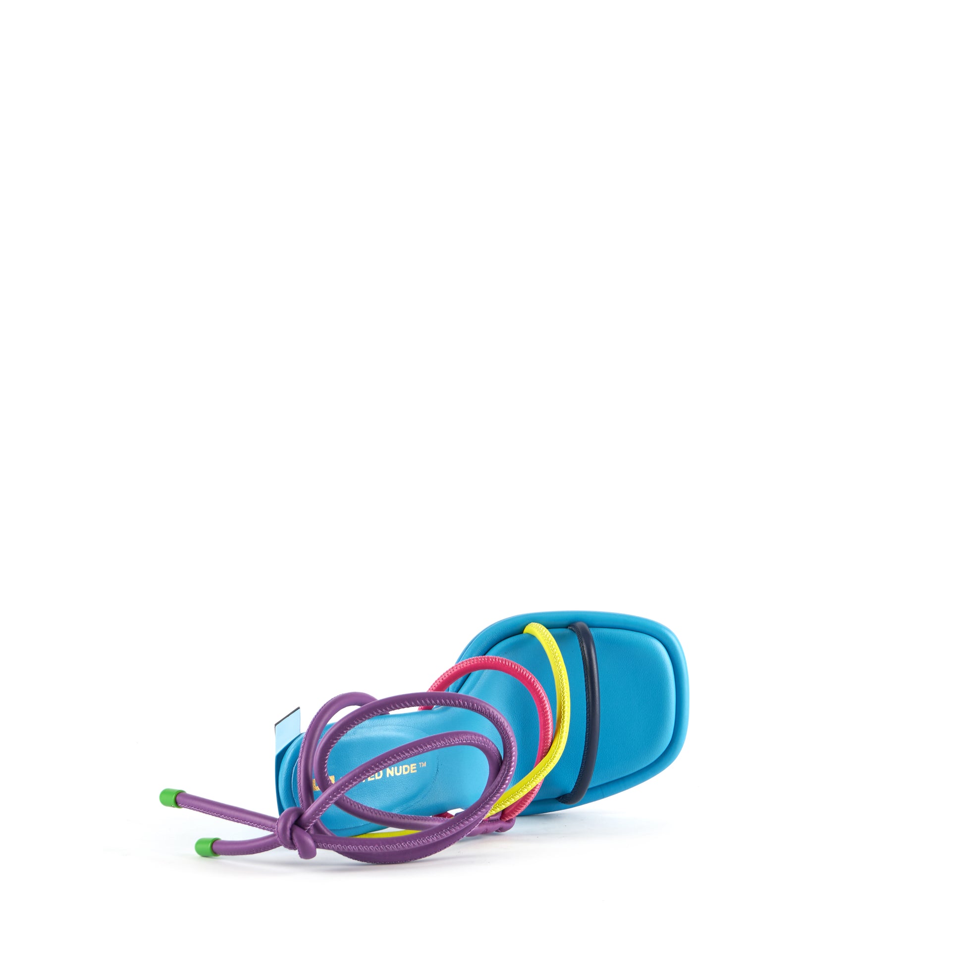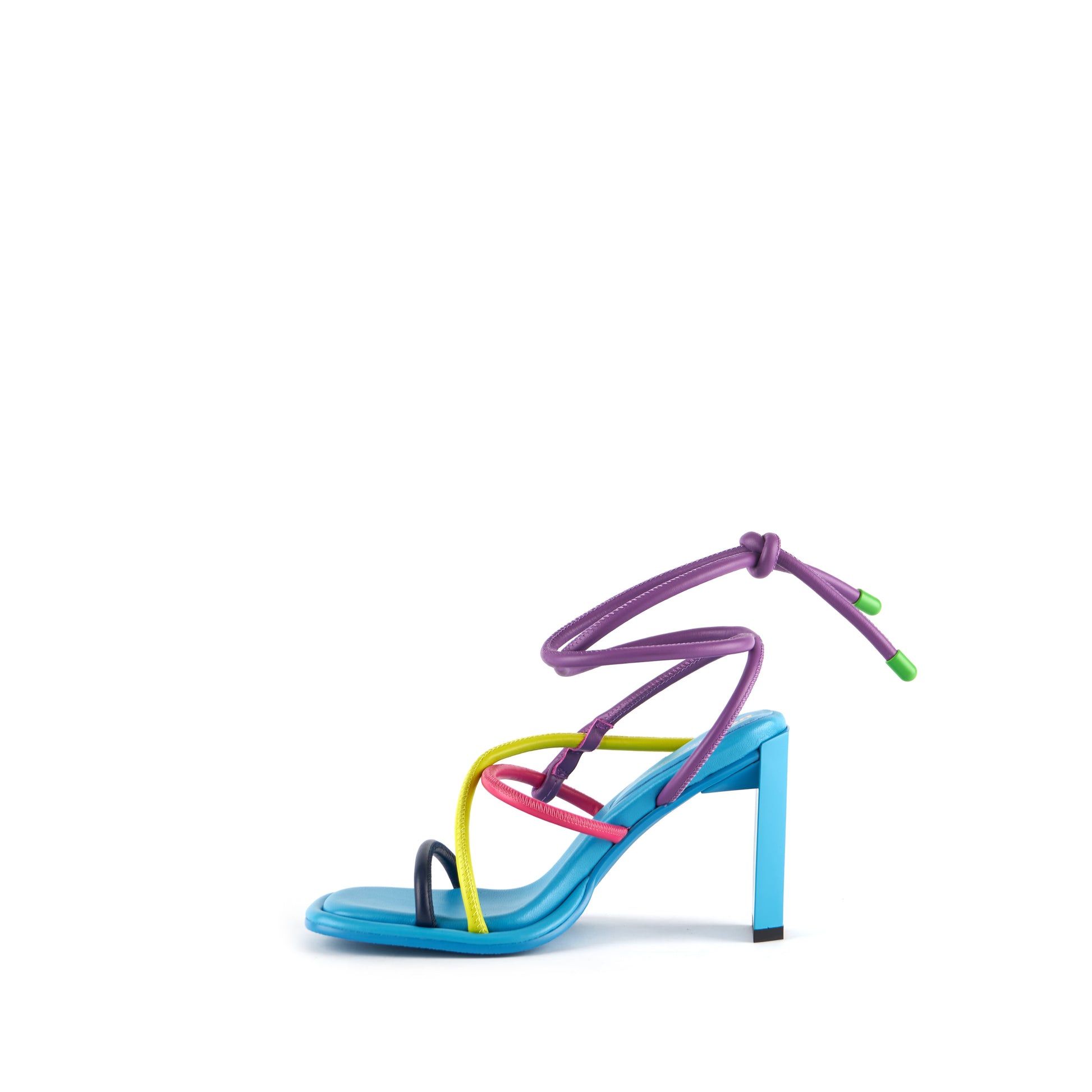 the tara ka hi is a strappy high-heeled sandal with puffed leather straps, an ankle tie with metal aglets, and an oversized rand